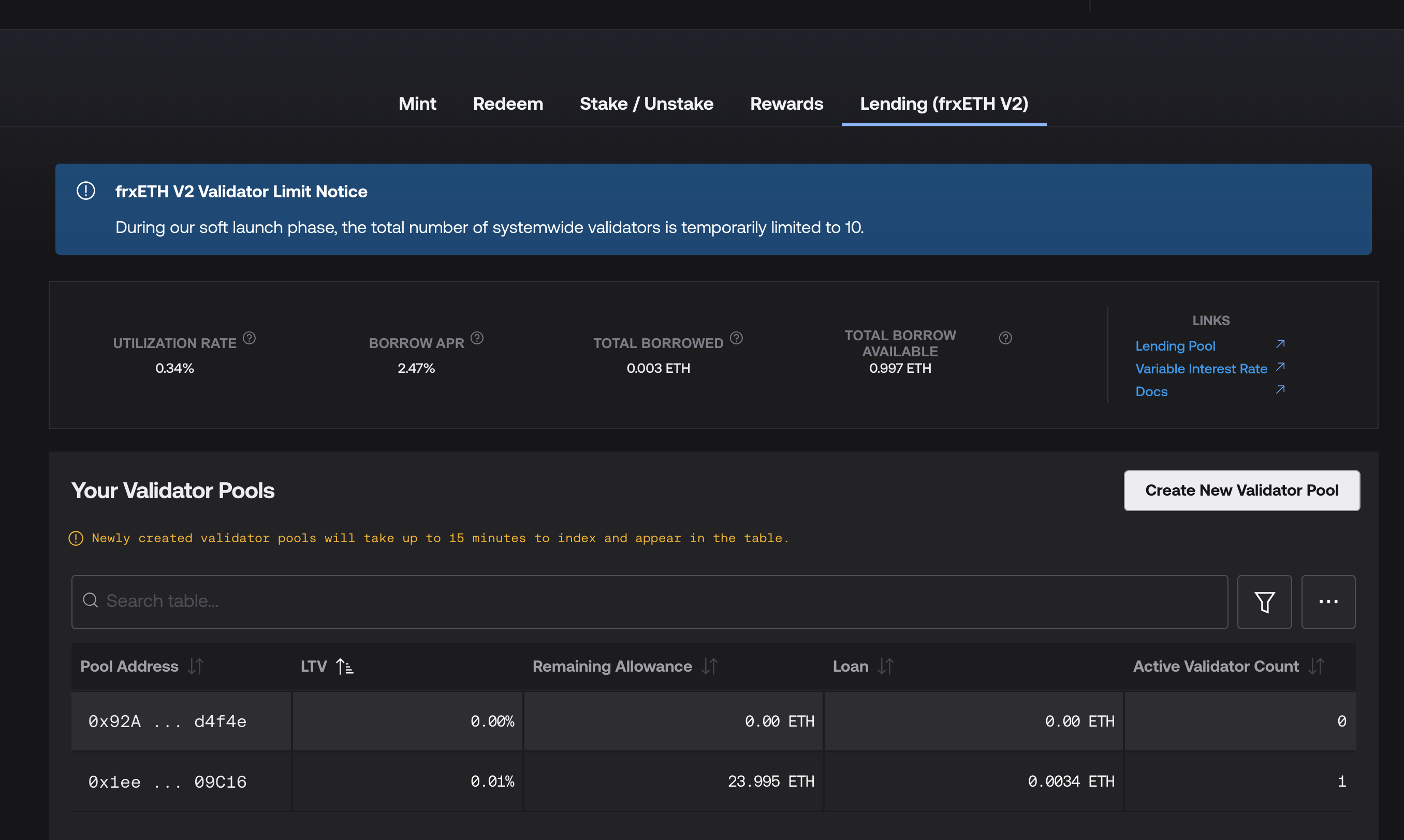 With frxETH V2, you can borrow ETH using your validators as collateral, while simultaneously earning normal ETH staking rewards (inc. MEV). For every validator deposited, you earn up to 24 ETH of borrowing credit (75% LTV), subject to ETH availability in the protocol. Future governance votes, on a case-by-case basis for trusted parties and depending on exit queue conditions, may raise the allowance up to 30 ETH of credit per 32 ETH deposited. You can freely withdraw this borrowed ETH, or use it to spin up even more validators. The borrow APR varies depending on supply and demand, and new ETH becomes available as more users mint frxETH and pay interest on loans. Full docs here.