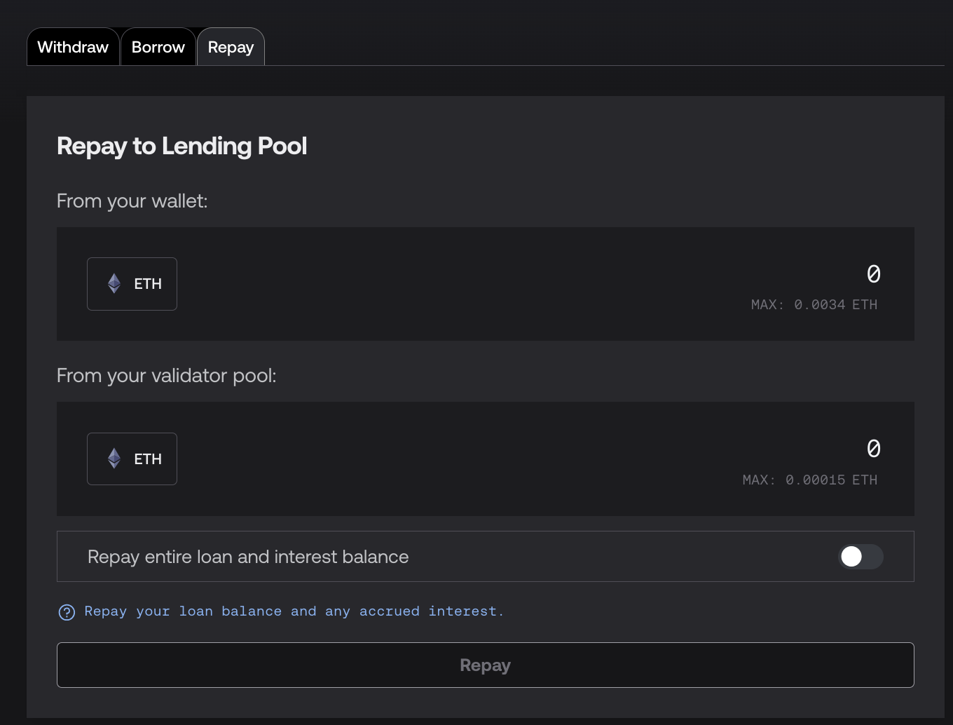 Click on the Repay tab. Here you can repay your loan with ETH from your wallet, ETH sitting in your ValidatorPool contract, or a combination of both.