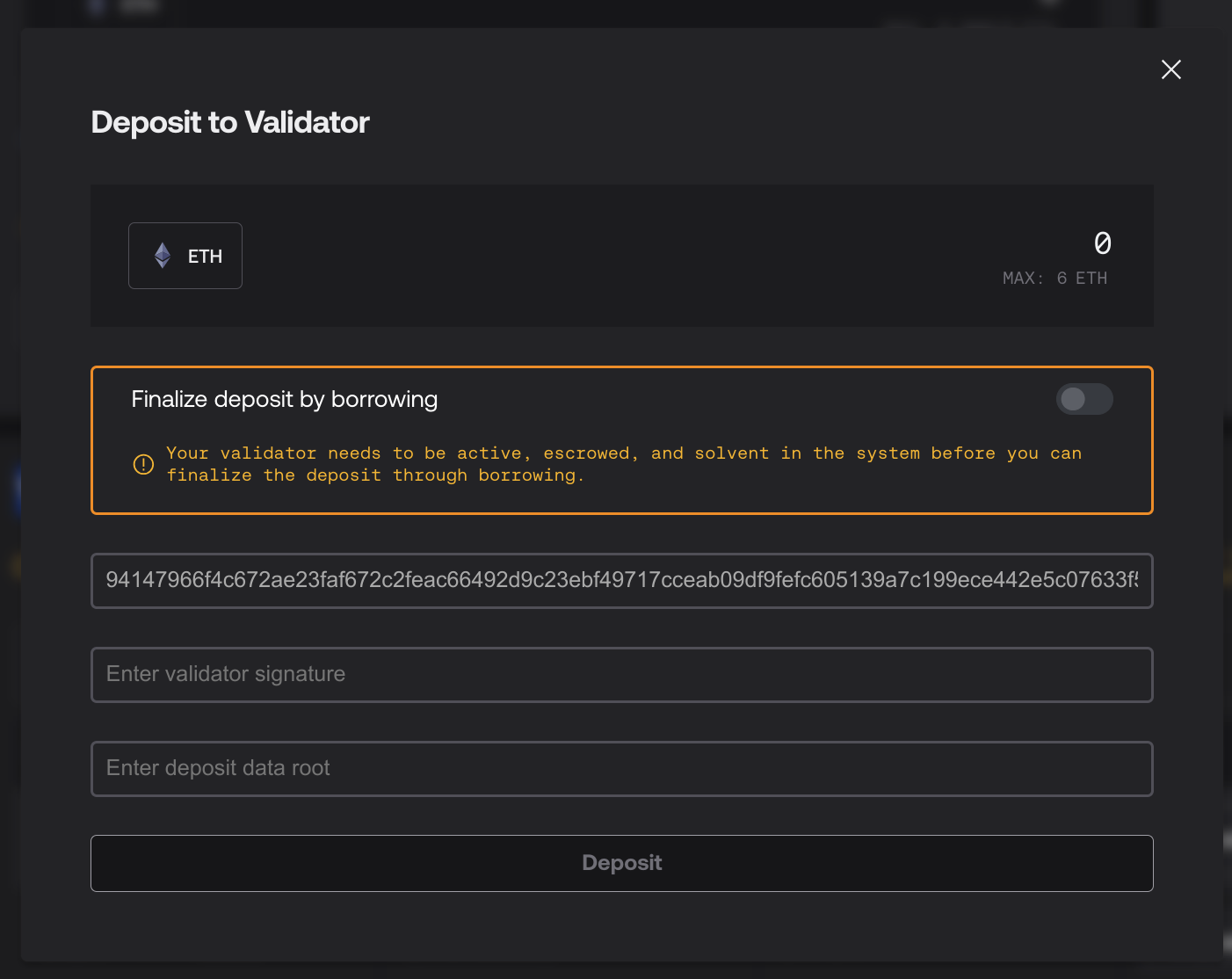 If you deposited 32 ETH in Step 3, you can skip this step. Otherwise, you will now need to complete your deposit with borrowed ETH. Generate a deposit message for the remaining ETH needed (32 - <what you put in step 3>) and make sure the “Finalize deposit by borrowing” switch is on. Click “Deposit”, then execute the message. Wait approximately 15 minutes.
