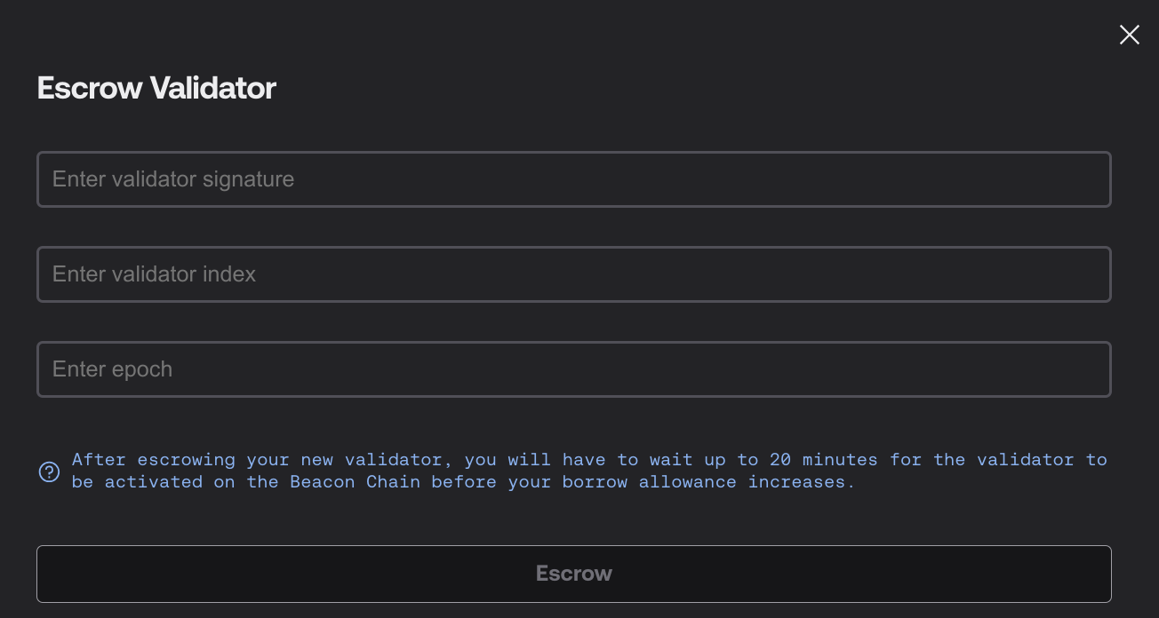 Under the “Your Validators” section, find your pubkey and click the “Escrow” button. Using ethdo or a similar script, generate a pre-signed exit message for your validator, then enter the details here. Wait approximately 20 minutes for the Beacon Oracle bot to register the escrow.