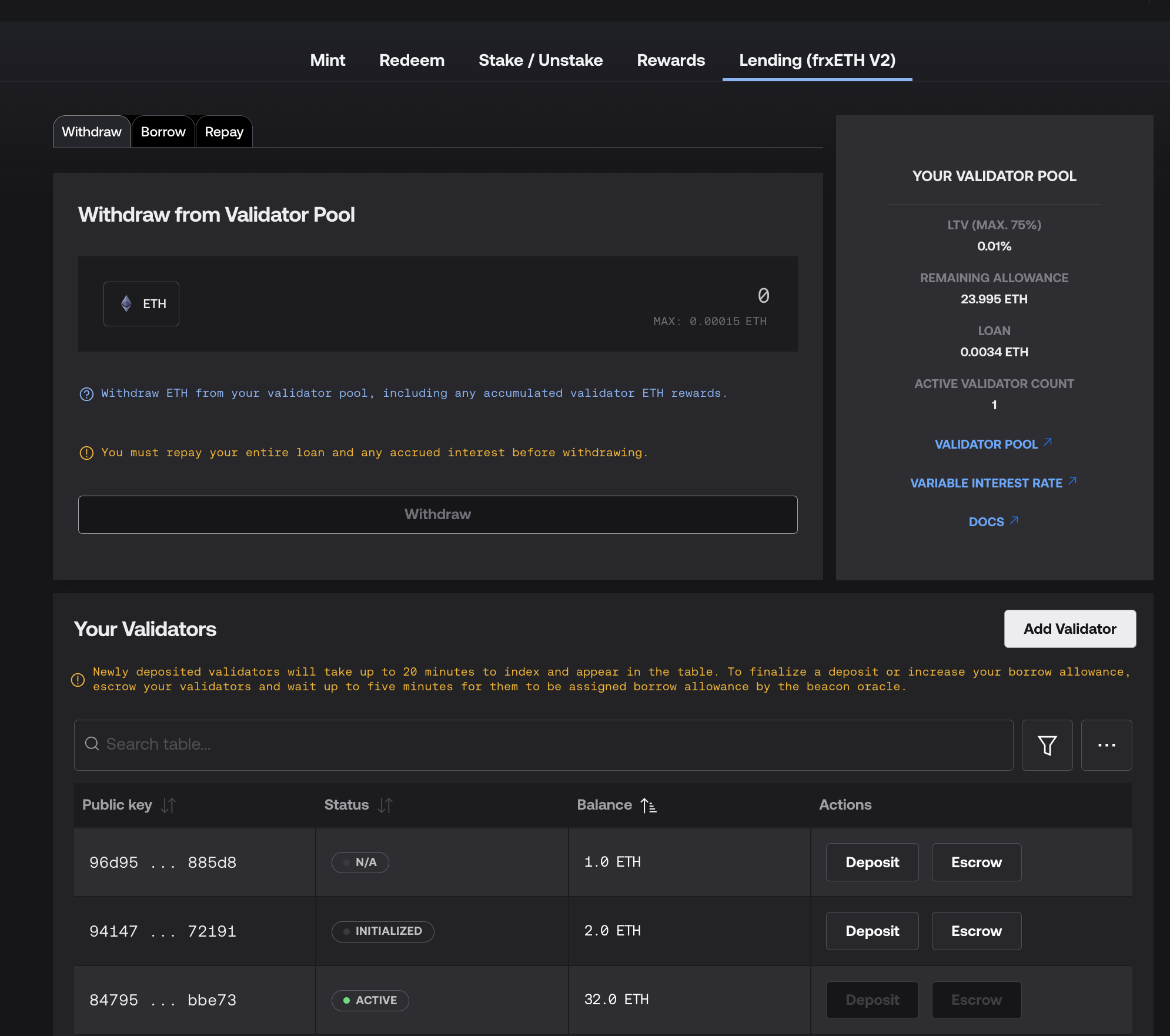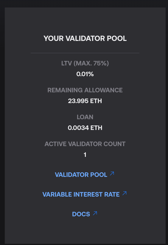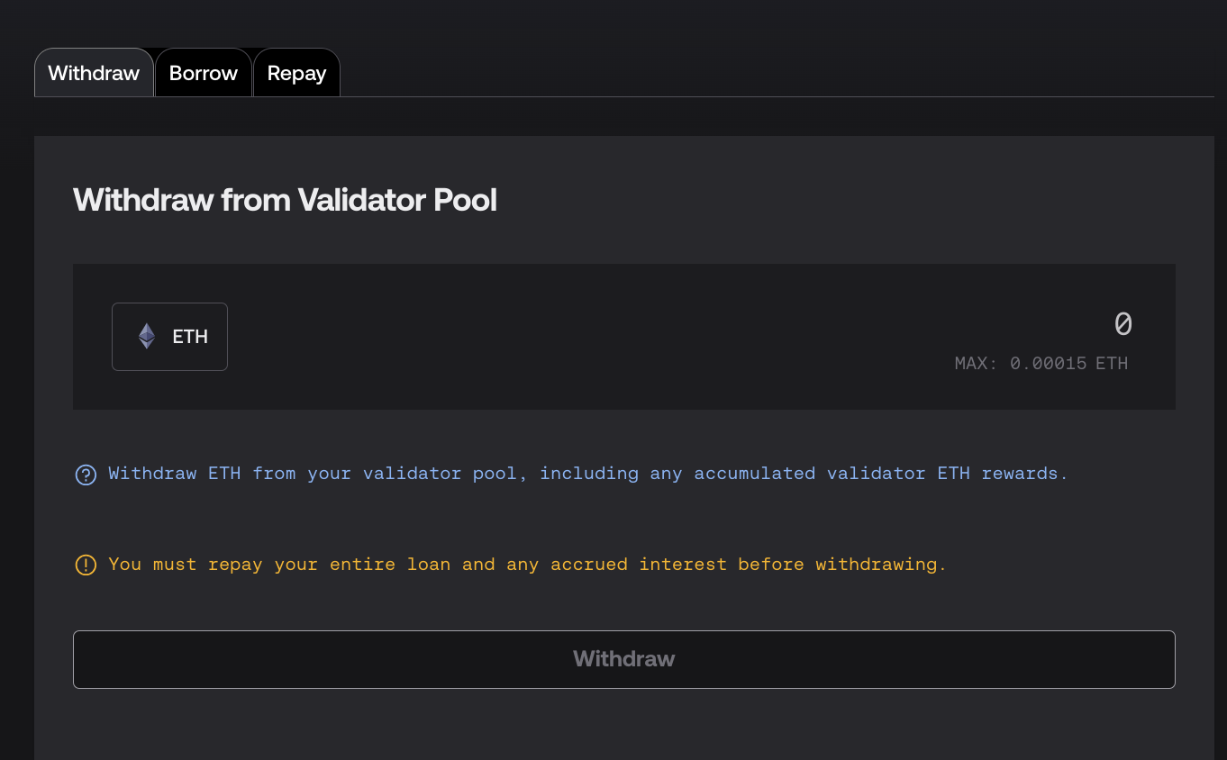Click on the Withdraw tab. Assuming all of your loans are repaid, you can withdraw any ETH remaining in the ValidatorPool contract.