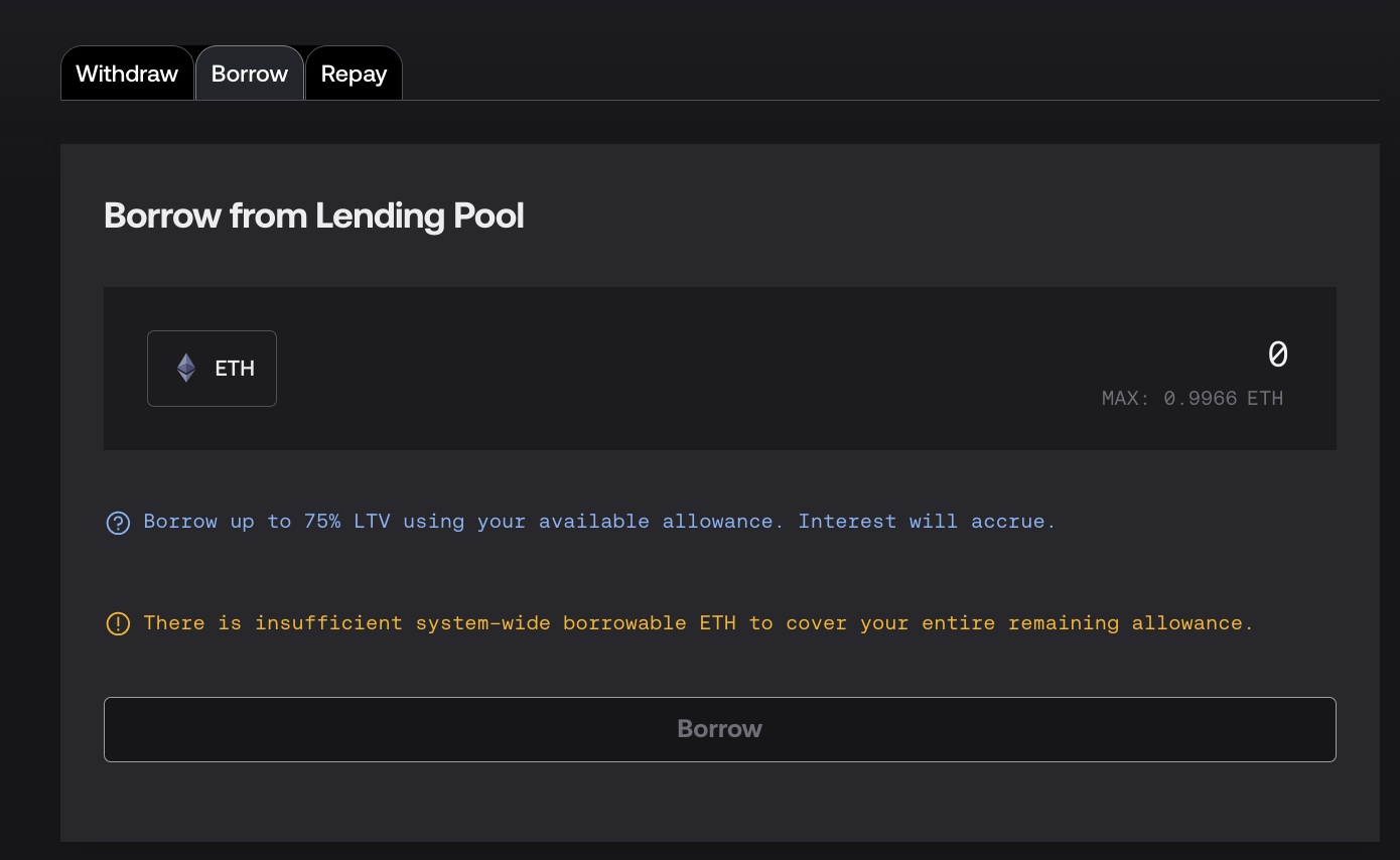 Click on the Borrow tab. You should now be able to borrow ETH, subject to availability. In this example, there is only 0.9966 ETH free in the system for you to borrow. As more frxETH is minted, and users pay interest, more ETH will become available.