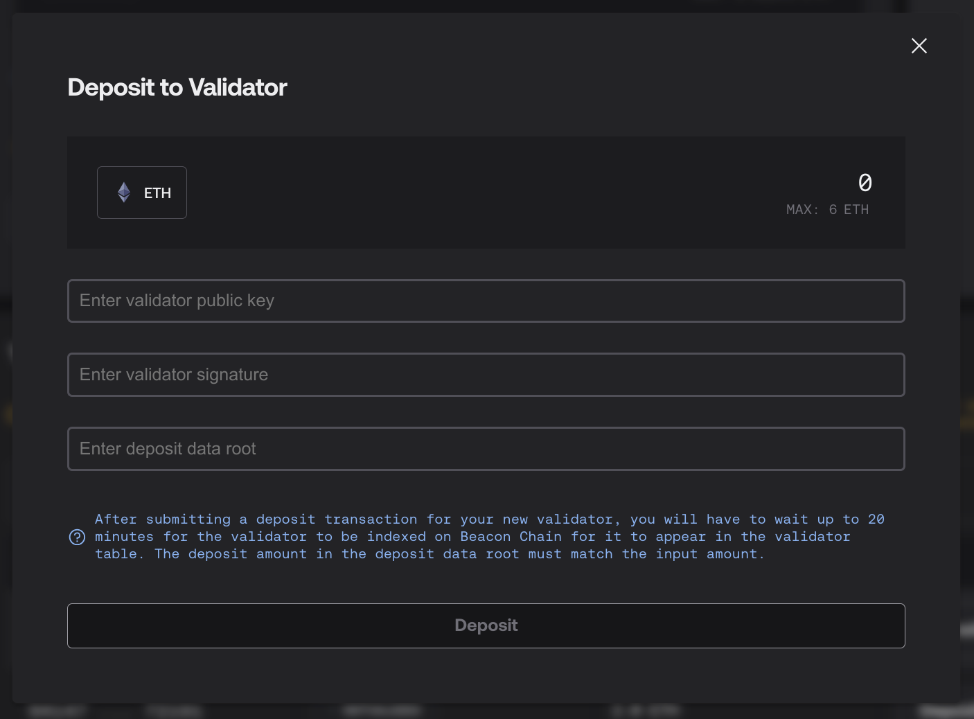 Enter your pubkey, validator signature, and deposit data root. There are many programs you can use, such as ethdo. The script used to generate this information must match the amount of ETH you plan to deposit. The amount must be an integer between 1 and 32 ETH inclusive.